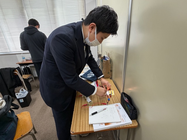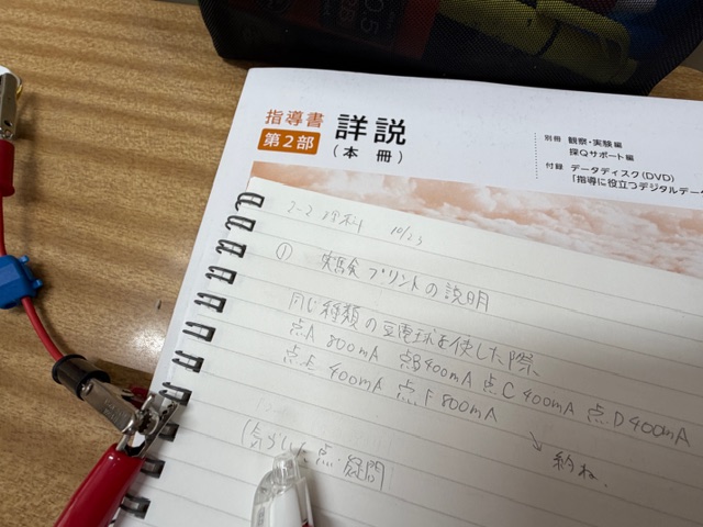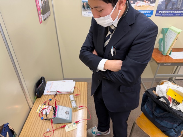 理科を担当している遠藤先生は、2年生の「電気」の範囲を実験で教えようと、事前の実験中。