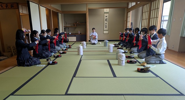 2025年10月29日(水曜日) 【2年】礼法学習_秋 秋の礼法学習です。 お軸は ”一期一会” 一緒に、この場この時を過ごす、とても貴重に思えます。 静かな空間で、しずかに茶巾をたたみます。 お菓子は、オレンジ色のかぼちゃを模したお菓子でした。