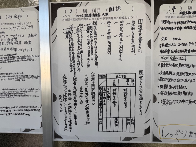 生徒たちが相談しあい、各グループで教科ごとのまとめを作成しました。