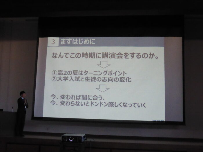 全統模試の結果分析などを踏まえ、今、このときに変化することの重要性、先を見通してやるべきことに取り組むことなど、受験生としての意識を持つことの重要性に気づかせていただけた講演会となりました。生徒たちは、先生のアドバイスを胸に、今、このときをきっかけに、自分の人生をしっかり考え、行動していこうという気持ちを持つことができました。山内先生、本日はどうもありがとうございました。