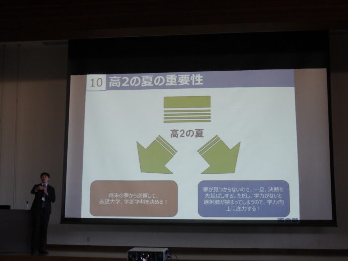 全統模試の結果分析などを踏まえ、今、このときに変化することの重要性、先を見通してやるべきことに取り組むことなど、受験生としての意識を持つことの重要性に気づかせていただけた講演会となりました。生徒たちは、先生のアドバイスを胸に、今、このときをきっかけに、自分の人生をしっかり考え、行動していこうという気持ちを持つことができました。山内先生、本日はどうもありがとうございました。