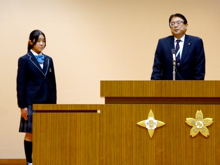 続いて、全国大会に出場する生徒の壮行会が行われました。空手で全国大会に出場する高野仁杏さん(2⁻2)です。高野さんは、第20回全国中学生空手道選抜大会県予選 個人組手で第4位に入賞し、3月27日(金)~29日(日)に京都の亀岡運動公園体育館で行われtるJOCジュニアオリンピックカップ県第20回全国中学生空手道選抜大会に出場することが決定しました。