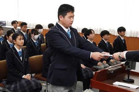 クラスの代表生徒が、学校より記念品(目録)を受け取りました。