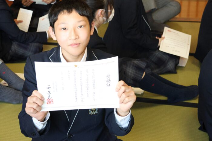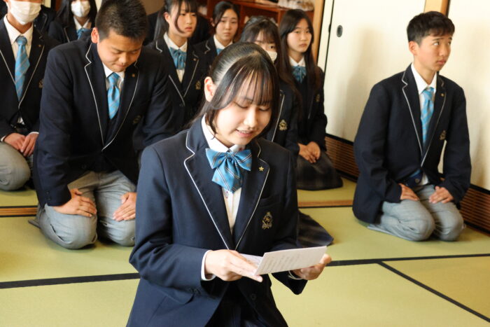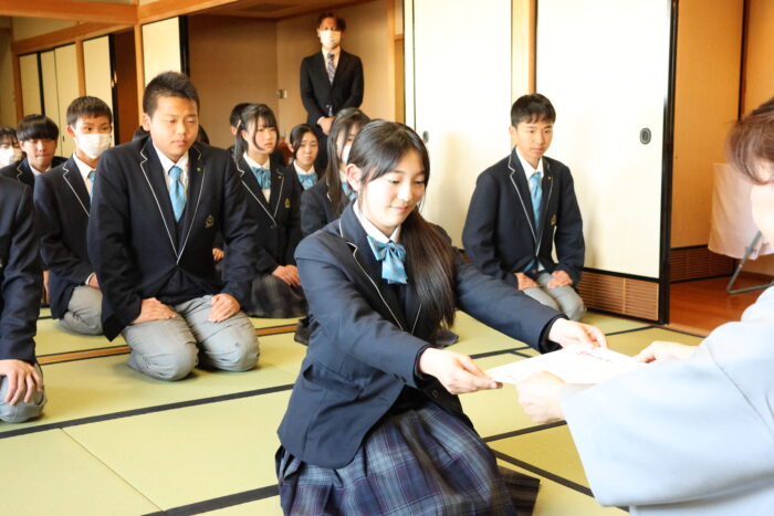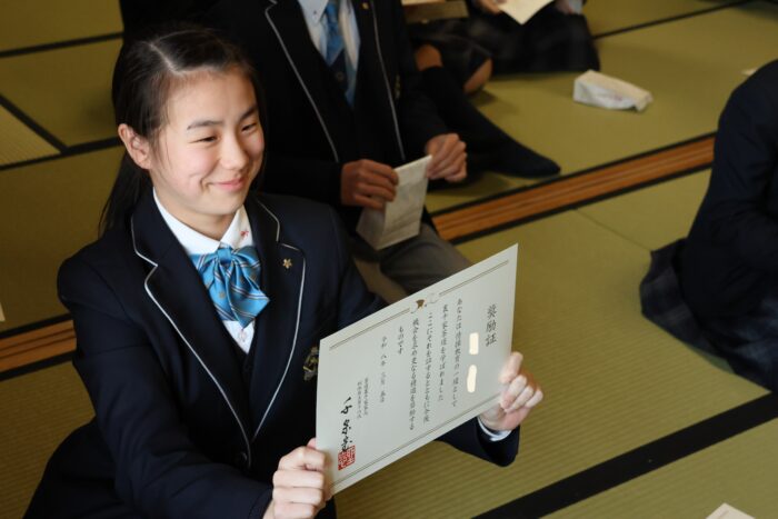 その後、各クラスの代表生徒に修了証が手渡され、生徒からの感謝の言葉が述べられました。