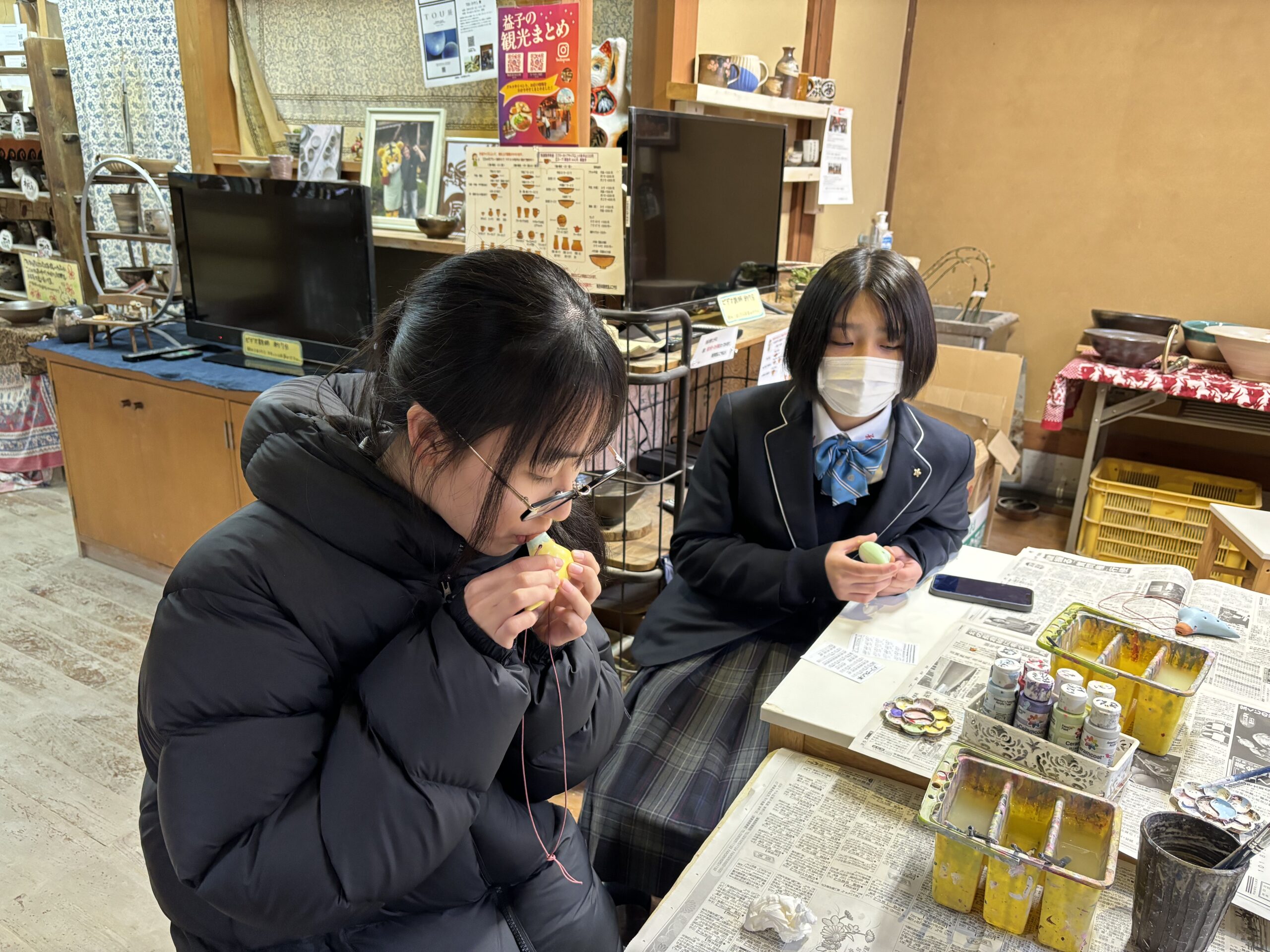 ギャラリー見学後、益子焼のオカリナに絵付けをしました。時間は30分と短いながら夢中で思い思いのデザインをし、来上がると上手にメロディーを奏でることができました。