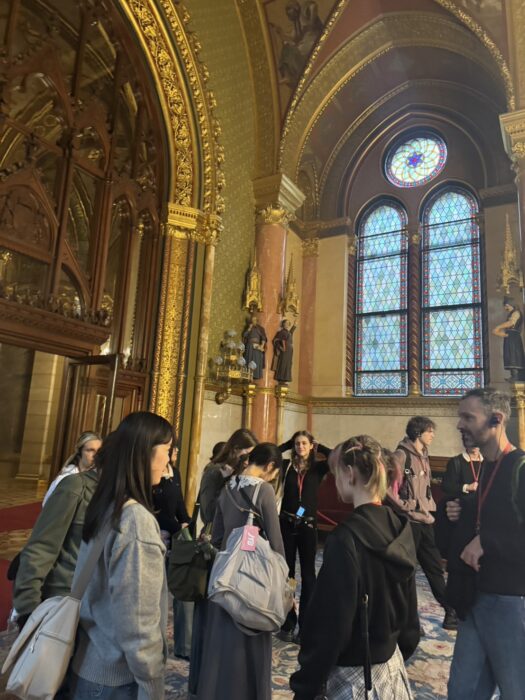 その後は、楽しみにしていた国会議事堂の見学です。世界一美しいと言われ、ドナウ川沿いに建つ世界で3番目の大きさを誇る壮麗な建築物で、ブダペストの象徴的な存在です。中でも歴代のハンガリー王が代々受け継いできた聖イシュトバーンの本物の王冠(ここだけ撮影不可)を見ることができたのは貴重な体験です。